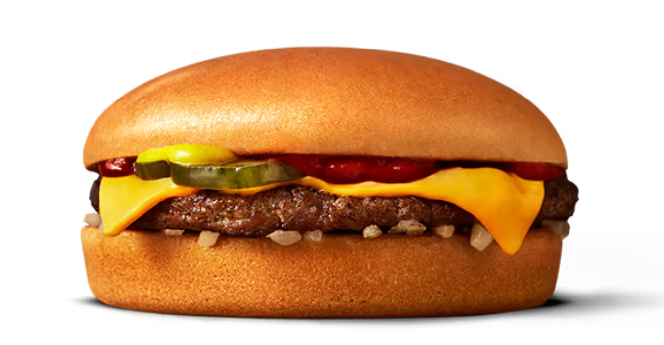 En bøf af 100% oksekød, hakkede løg, pickles, sennep, ketchup og en skive smelteost med cheddar i en ristet bolle.