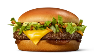 To 113 g oksekødsbøffer (226 g kød), Tasty sauce, to skiver smelteost med hvid cheddar, salat, tomat, løg og sprød bacon i sesambolle.